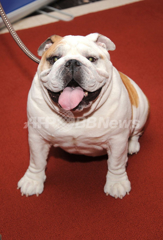 写真は、アメリカンケンネルクラブがニューヨーク(New York)で開いた人気犬種発表の記者会見に出席したブルドッグ(2013年1月30日撮影)。(c)AFP/Getty Images for the American Kennel Club/Gary Gershoff