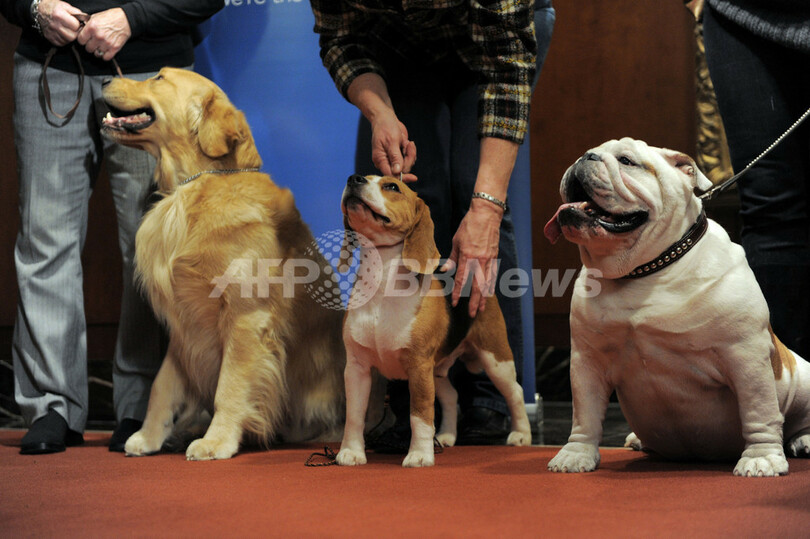写真は、アメリカンケンネルクラブがニューヨーク(New York)で開いた人気犬種発表の記者会見に出席した(左から)ゴールデンレトリバー、ビーグル、ブルドッグ(2013年1月30日撮影)。(c)AFP/Stan HONDA
