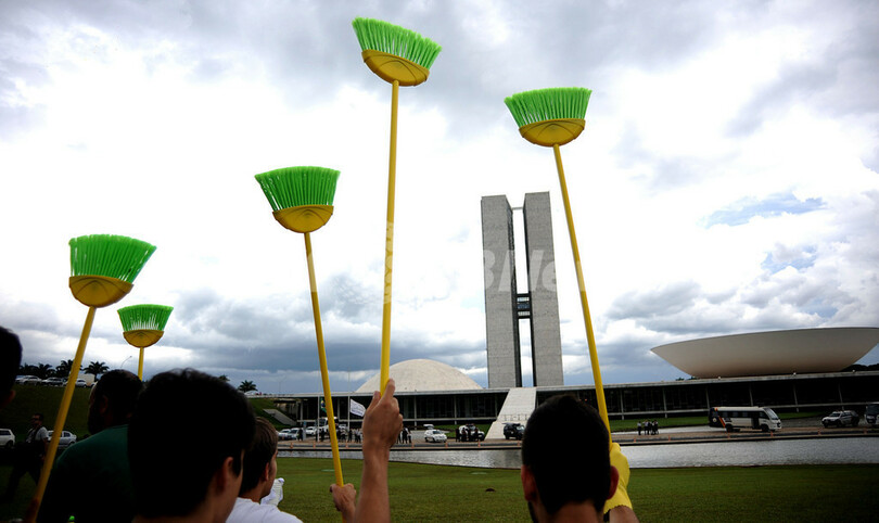 これは、同国リオデジャネイロ(Rio de Janeiro)を拠点に展開する「リバー・オブ・ピース(River of Peace)」運動によるデモ。81という数字はブラジル連邦議会上院の議員定数で、並べられた「お掃除セット」は「腐敗した議会を掃除せよ」というアピールを意味している。ブラジル議会上院は今週、上院議長の選出を控えているが、最有力候補のレナン・カリェリオス(Renan Calherios)議員には数々の汚職疑惑が指摘されている。