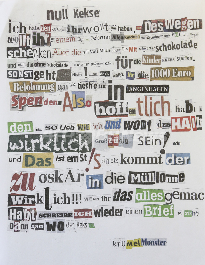 地元紙「ハノーファーシェ・アルゲマイネ(Hannoversche Allgemeine Zeitung)」が31日までに公開した、犯行声明に同封されていたという写真には、クッキーモンスターの着ぐるみをまとった人物が、盗まれた「金色のクッキー」をかじる姿が写っている。声明は、「クッキー」を返してほしければ病院に入院している子どもたちに無料でクッキーを配るよう、バールセンに要求している。