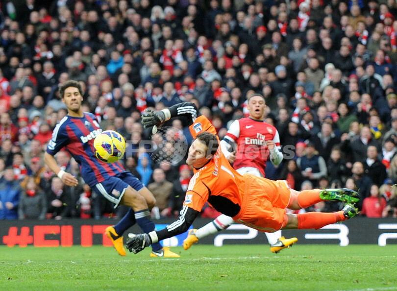 アーセナルのアレックス・オックスレイド・チェンバレン(Alex Oxlade-Chamberlain、奥)のシュートをセーブするストーク・シティのGKアスミール・ベゴヴィッチ(Asmir Begovic、2013年2月2日撮影)。(c)AFP/OLLY GREENWOOD