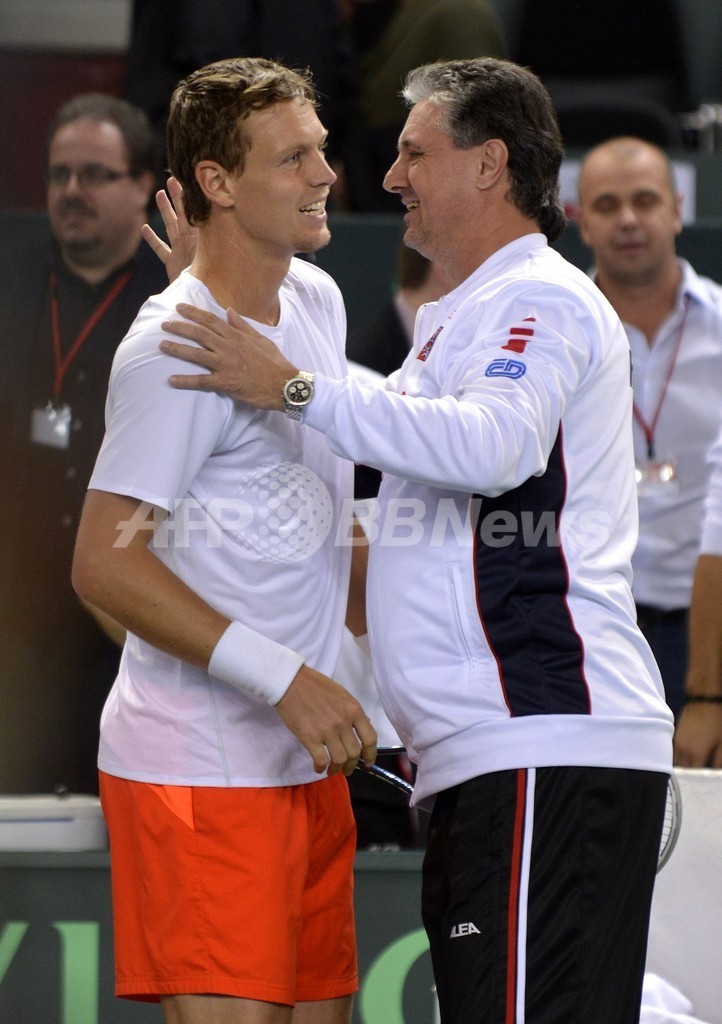 試合後、ヤロスラフ・ナブラチル(Jaroslav Navratil)監督からねぎらいを受けるチェコのトマス・ベルディハ(2013年2月2日撮影)。(c)AFP/SEBASTIEN FEVAL