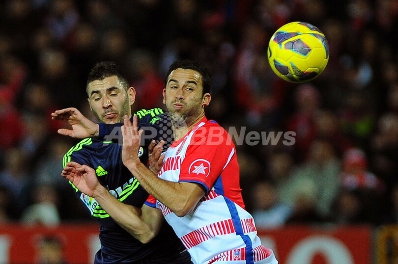 グラナダのイニゴ・ロペス(Inigo Lopez、左)とボールを競るレアル・マドリードのカリム・ベンゼマ(Karim Benzema、2013年2月2日撮影)。(c)AFP/JORGE GUERRERO