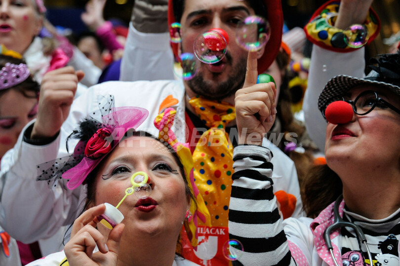 写真は、ベルンの連邦院(Federal Place)前で芸を披露するクラウン・ドクターたち(2013年1月30日撮影)。(c)AFP/SEBASTIEN BOZON