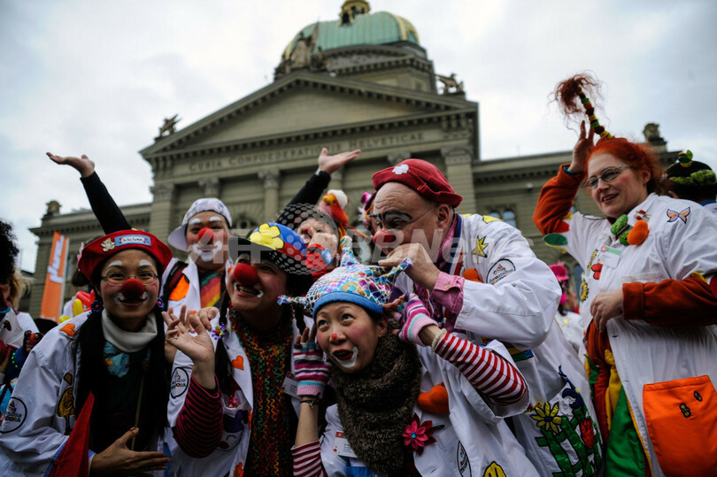 写真は、ベルンの連邦院(Federal Place)前で芸を披露するクラウン・ドクターたち(2013年1月30日撮影)。(c)AFP/SEBASTIEN BOZON