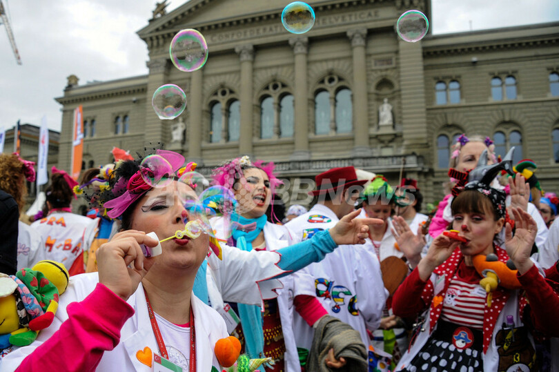 写真は、ベルンの連邦院(Federal Place)前で芸を披露するクラウン・ドクターたち(2013年1月30日撮影)。(c)AFP/SEBASTIEN BOZON