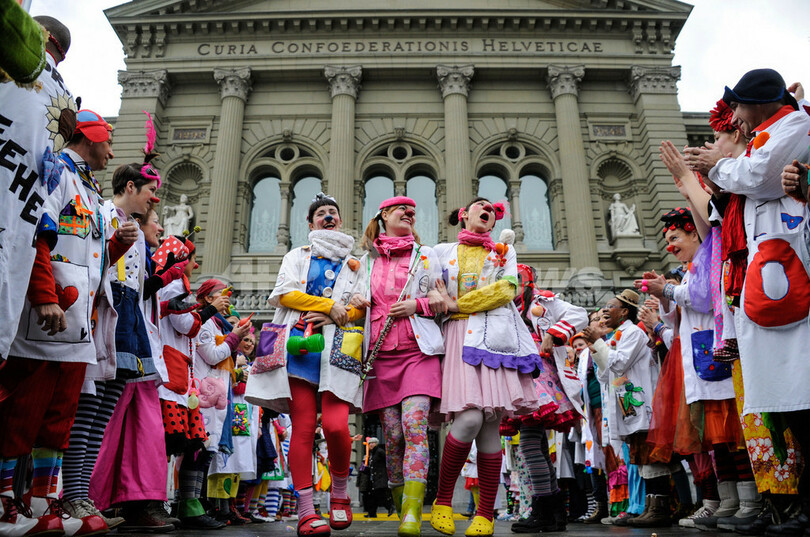 写真は、ベルンの連邦院(Federal Place)前で芸を披露するクラウン・ドクターたち(2013年1月30日撮影)。(c)AFP/SEBASTIEN BOZON