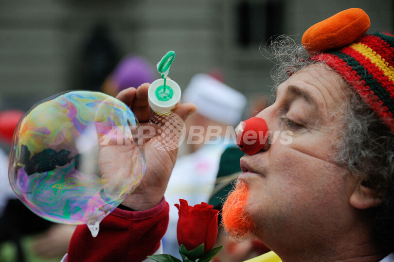 写真は、ベルンの連邦院(Federal Place)前で芸を披露するクラウン・ドクターたち(2013年1月30日撮影)。(c)AFP/SEBASTIEN BOZON