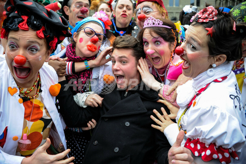 写真は、ベルンの連邦院(Federal Place)前で芸を披露するクラウン・ドクターたち(2013年1月30日撮影)。(c)AFP/SEBASTIEN BOZON