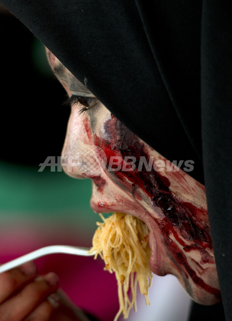 写真は、休憩中に焼きそばを食べるゾンビ(2013年2月2日撮影)。(c)AFP/Saeed KHAN