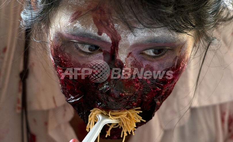写真は、休憩中に焼きそばを食べるゾンビ(2013年2月2日撮影)。(c)AFP/Saeed KHAN