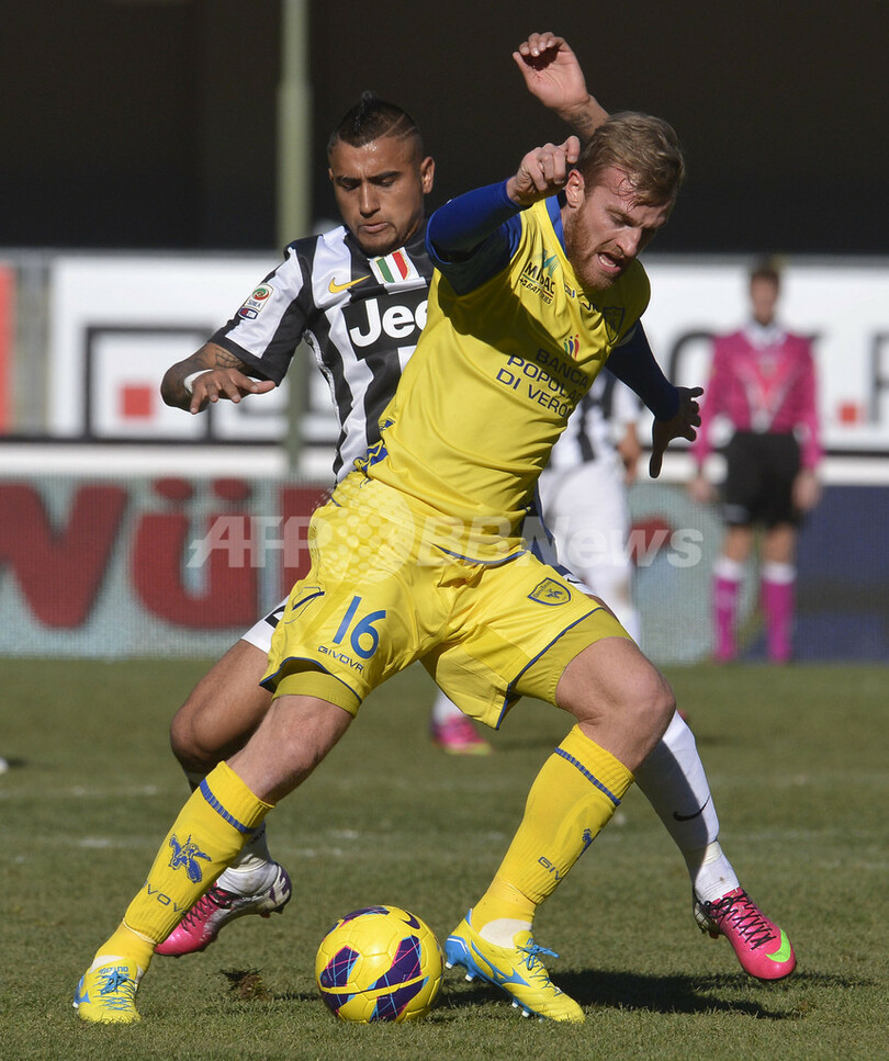 後半に入ると現在リーグ中位につけるキエーボの反撃を受け、同7分にはシリル・テロー(Cyril Thereau)に1点を返されたユベントスだったが、その後は逃げ切りに成功し、勝ち点を52に伸ばした。(c)AFP