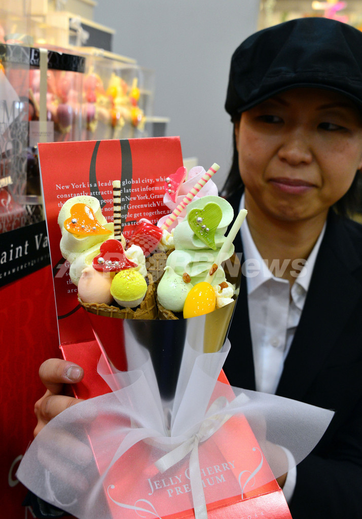動物やソフトクリームをかたどったカラフルなチョコレートなどが並び、その場で最後の仕上げを行うショコラティエの姿も見られた(2013年2月3日撮影)。(c)AFP/Yoshikazu TSUNO