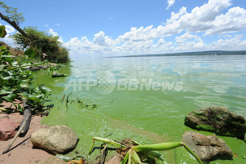 原因はシアノバクテリア(藍色細菌)とも呼ばれる藍藻の大量発生。5か月前に初めて発生が確認されて以降、湖水の汚染度は過去最悪の状態になっており、ひどい悪臭のためアレグアから他地域へと転居する住民も相次いでいるという(2013年2月2日撮影)。(c)AFP/Norberto DUARTE