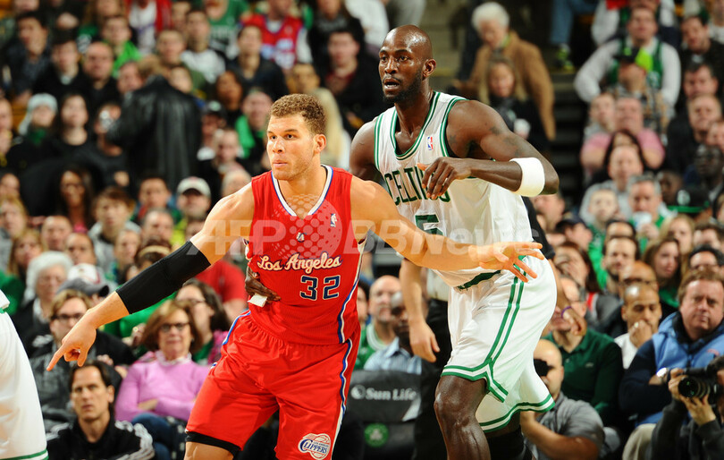 ボストン・セルティックスのケビン・ガーネット(Kevin Garnett、右)のマークを受けるロサンゼルス・クリッパーズのブレイク・グリフィン(Blake Griffin、2013年2月3日撮影)。(c)AFP/Getty Images/NBAE/Brian Babineau
