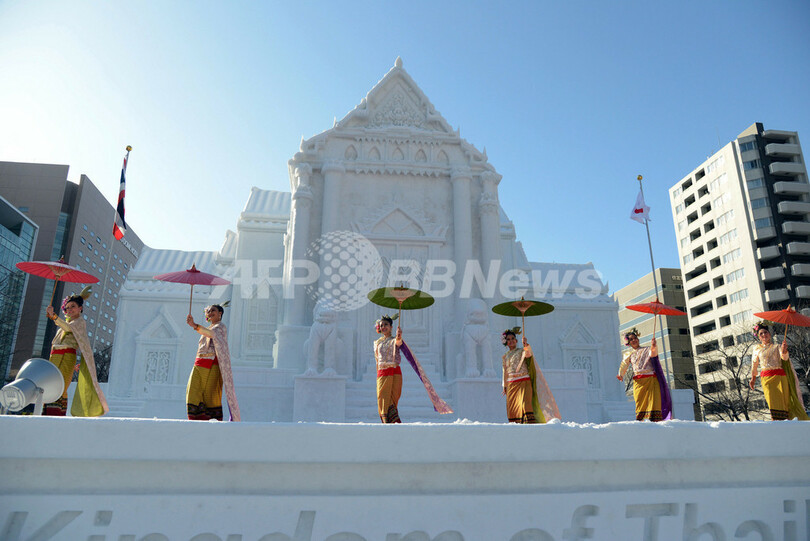 写真は、タイのワット・ベンチャマボピット(大理石寺院、Wat Benchamabophit)の大雪像の前で伝統舞踊を披露するタイのダンサーたち(2013年2月5日撮影)。(c)AFP/TAKASHI NOGUCHI