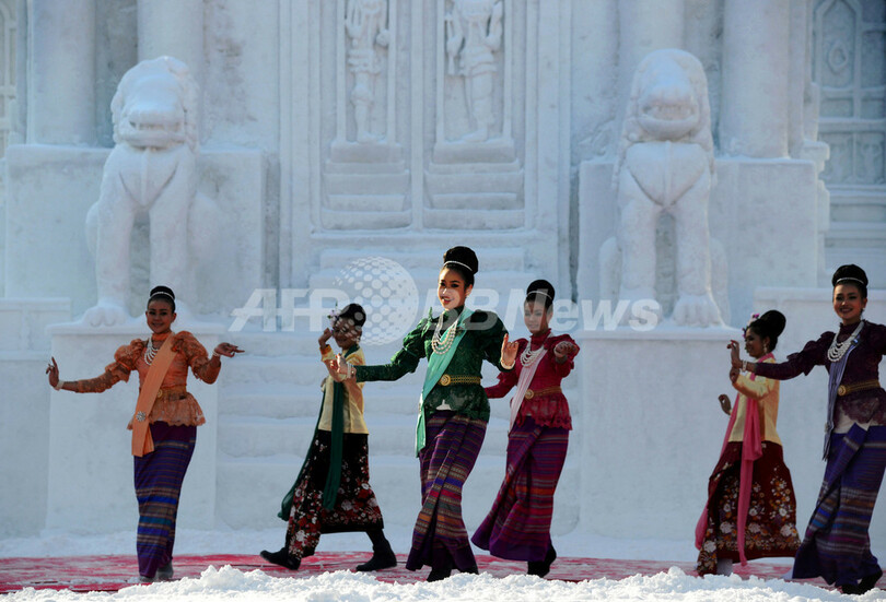 写真は、タイのワット・ベンチャマボピット(大理石寺院、Wat Benchamabophit)の大雪像の前で伝統舞踊を披露するタイのダンサーたち(2013年2月5日撮影)。(c)AFP/TAKASHI NOGUCHI