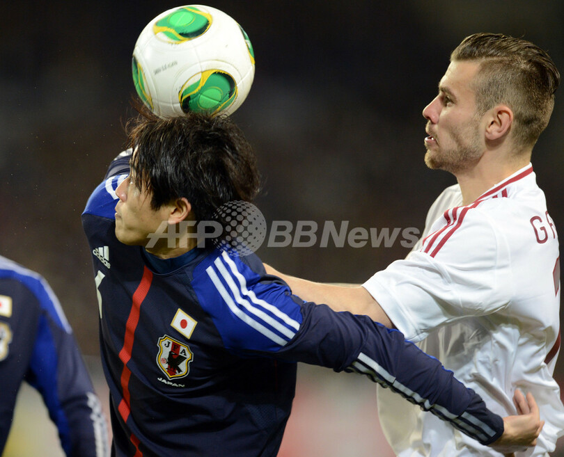 ラトビアのエドガルス・ガウラチュス(Edgars Gauracs、右)とボールを競る日本の内田篤人(Atsuto Uchida、2013年2月6日撮影)。(c)AFP/TOSHIFUMI KITAMURA