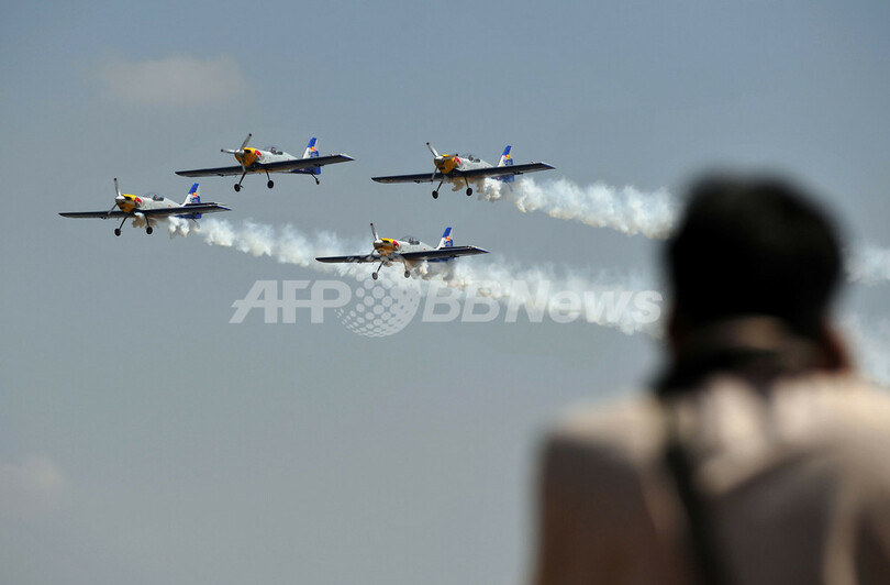 写真は、会場上空でズリーン(Zlin)Z50型機を使った曲芸飛行を披露するチェコのアクロバット飛行隊「フライング・ブルズ(Flying Bulls)」(2013年2月6日撮影)。(c)AFP/Manjunath KIRAN