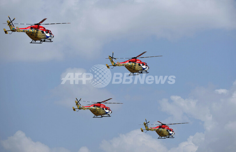 写真は、会場上空でヒンドスタン航空機(HAL)製ヘリコプター「Dhruv」を使いデモ飛行を行うインド空軍のアクロバット飛行隊「Sarang」(2013年2月6日撮影)。(c)AFP/Manjunath KIRAN