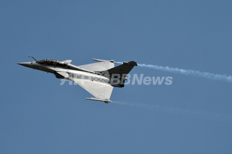 写真は、会場上空でデモ飛行を行う仏ダッソー(Dassault)の「ラファール(Rafale)」戦闘機(2013年2月6日撮影)。(c)AFP/Manjunath KIRAN