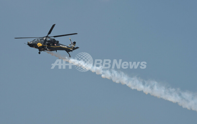 写真は、会場上空でデモ飛行を行う、ヒンドスタン航空機(HAL)が開発を進めている軽攻撃ヘリコプター(LCH)「ブラック・タイガー(Black Tiger)」(2013年2月6日撮影)。(c)AFP/Manjunath KIRAN