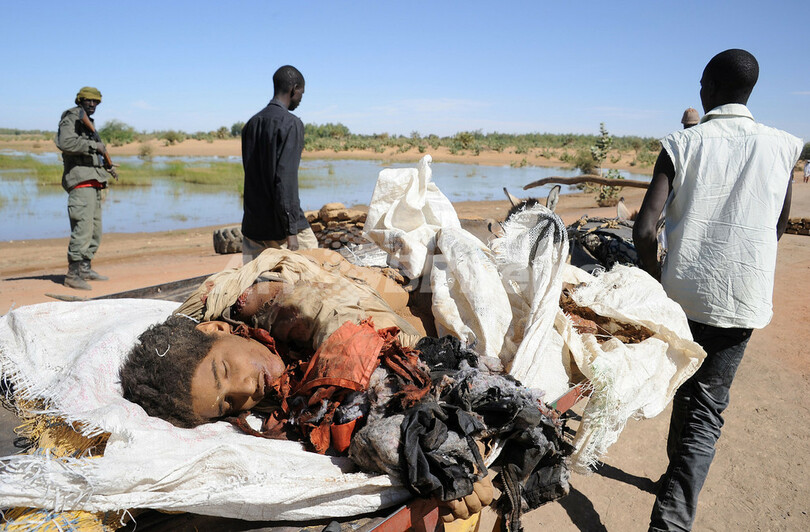 マリ北部ガオ(Gao)にある軍の検問所で自爆した男の遺体を運ぶ人々(2013年2月8日撮影)。(c)AFP/PASCAL GUYOT