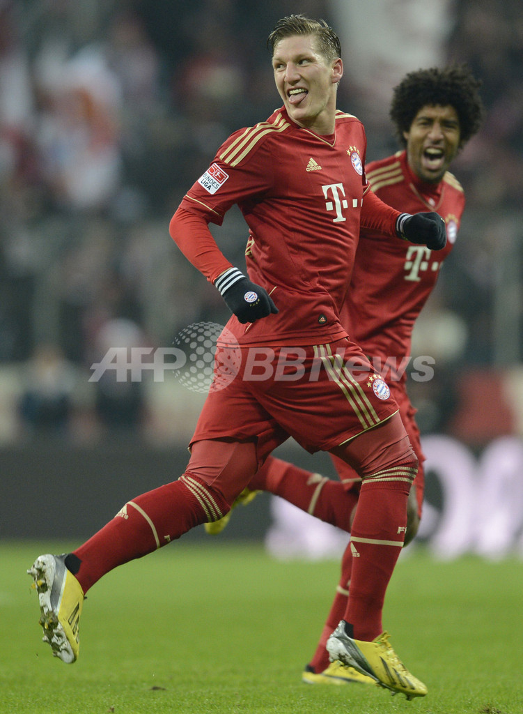 前半32分にチームの2得点目を決めて喜ぶバイエルン・ミュンヘンのバスティアン・シュバインシュタイガー(Bastian Schweinsteiger、2013年2月9日撮影)。(c)AFP/CHRISTOF STACHE