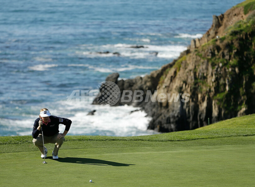 この大会では、ペブルビーチ・ゴルフリンクス、モントレー・ペニンシュラCC(Monterey Peninsula Country Club)、スパイグラス・ヒル(Spyglass Hill)の3コースでローテーションを組み、アマチュア選手とともにラウンドする。(c)AFP