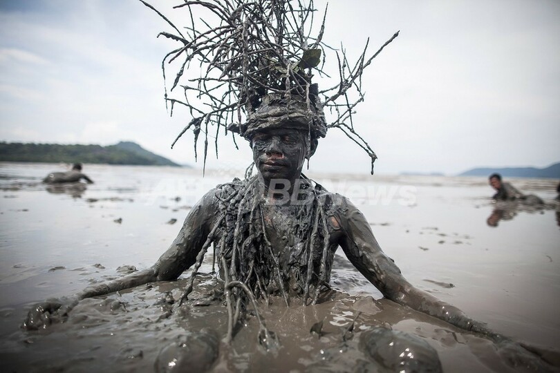 1986年から続くこの祭りは、男性2人がふざけて泥をかけ合ったのが始まり。参加者らは原始人になったつもりで、ぼろをまとい、手には植物の茎や骨、頭蓋骨に見立てた物などを持って、泥まみれになって楽しむ。(c)AFP