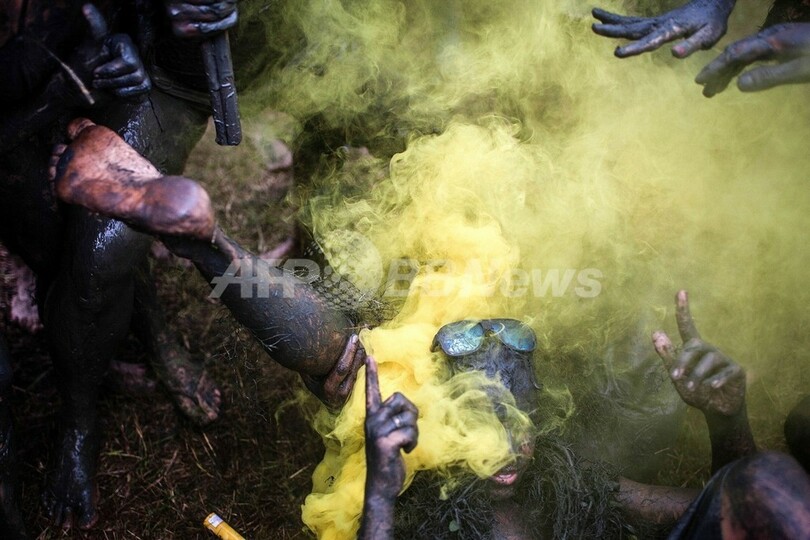 1986年から続くこの祭りは、男性2人がふざけて泥をかけ合ったのが始まり。参加者らは原始人になったつもりで、ぼろをまとい、手には植物の茎や骨、頭蓋骨に見立てた物などを持って、泥まみれになって楽しむ。(c)AFP