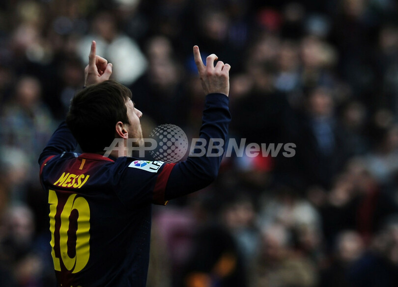 前半13分にチーム2得点目を挙げて喜ぶFCバルセロナのリオネル・メッシ(Lionel Messi、2013年2月10日撮影)。(c)AFP/LLUIS GENE