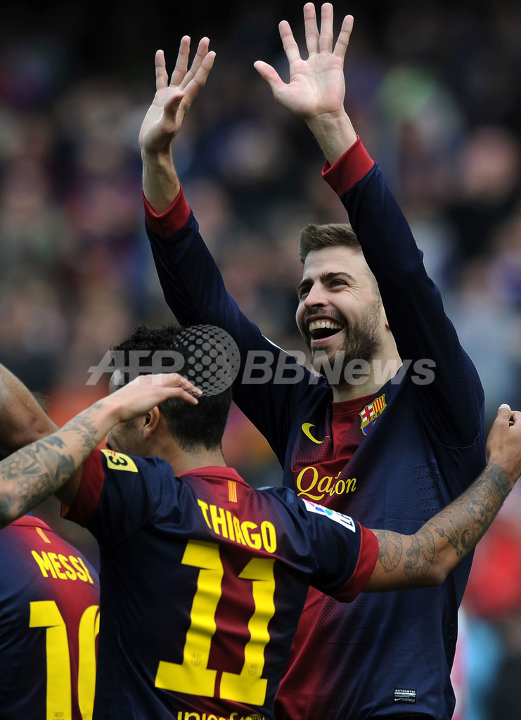 後半ロスタイムにチーム2得点目を挙げて喜ぶFCバルセロナのジェラール・ピケ(Gerard Pique、2013年2月10日撮影)。(c)AFP/LLUIS GENE