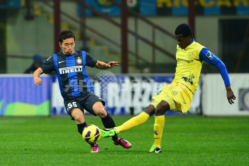 キエーボ・ベローナのイサーク・コフィー(Isaac Cofie、右)とボールを競るインテルの長友佑都(Yuto Nagatomo、2013年2月10日撮影)。(c)AFP/GIUSEPPE CACACE