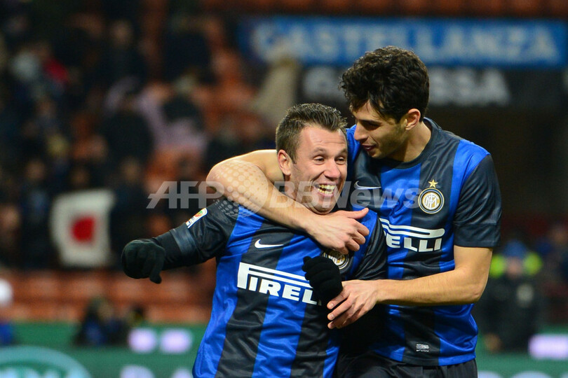 前半2分に先制点を挙げてアンドレア・ラノッキア(Andrea Ranocchia、右)に祝福されるインテルのアントニオ・カッサーノ(Antonio Cassano、2013年2月10日撮影)。(c)AFP/GIUSEPPE CACACE