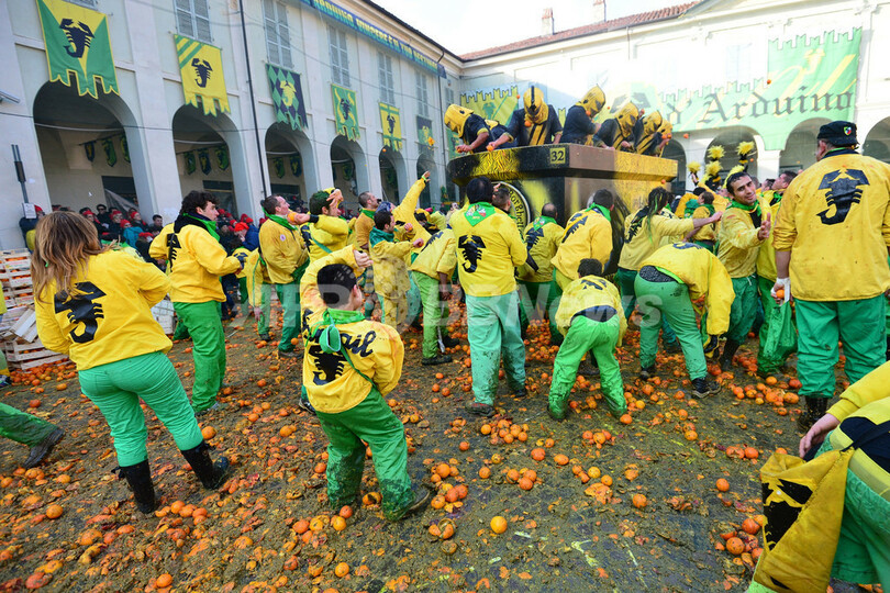 ニュース ライフ こぼれ話 飛び交う果実、イタリア名物「オレンジ合戦」開催 2013年2月11日 11:44 発信地:イブレア/イタリア [ ヨーロッパ イタリア ] このニュースをシェア ‹ › ❮ 5/17 ❯ イタリア北部トリノ(Turin)近郊のイブレア(Ivrea)で10日、カーニバルの伝統イベント「オレンジ合戦」が開催された。馬車に乗った領主の衛兵と、その周りを取り囲んだ民衆に扮(ふん)した人々がオレンジを投げ合う祭りで、中世にこの地を治めていた領主の圧政に対して民衆が起こした反乱にちなんでいる(2013年2月10日撮影)。(c)AFP/GIUSEPPE CACACE 画像作成中 ! 【2月11日 AFP】イタリア北部トリノ(Turin)近郊のイブレア(Ivrea)で10日、カーニバルの伝統イベント「オレンジ合戦」が開催された。馬車に乗った領主の衛兵と、その周りを取り囲んだ民衆に扮(ふん)した人々がオレンジを投げ合う祭りで、中世にこの地を治めていた領主の圧政に対して民衆が起こした反乱にちなんでいる。(c)AFP ライフ 一覧へ> メディア・報道関係・法人の方向け 写真・動画 購入のお問合せ>
