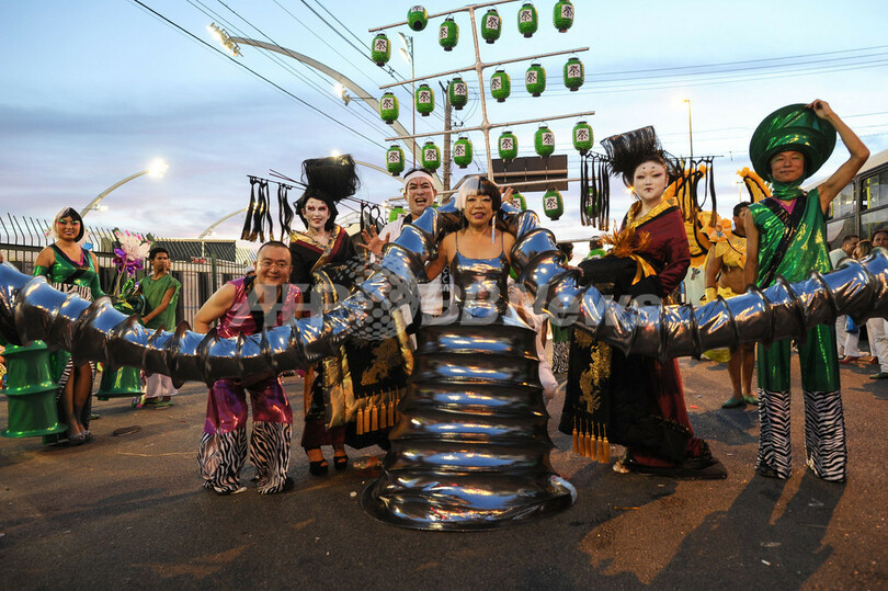 【2月13日 AFP】ブラジル・サンパウロ(Sao Paulo)のカーニバル最終日の12日、日本のファッションデザイナー、コシノジュンコ(Junko Koshino)さんが、自らデザインした衣装を身に付け、主会場サンボドロモ(Sambodrome)で行われたパレードに参加した。コシノさんはサンバチーム「バロッカゾナスル(Barroca Zona Sul)」の衣装デザインを担当。同チームは今年、日本人が多く住むコミュニティーや東洋風の庭園があるジャバクアラ(Jabaquara)地区の歴史をテーマにカーニバルに参加した。(c)AFP