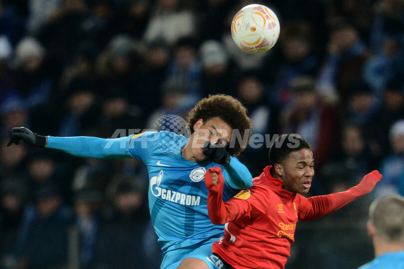 ボールを競るリバプールのラヒーム・スターリング(Raheem Sterling、右)とゼニト・サンクトペテルブルクのアクセル・ヴィツェル(Axel Witsel、2013年2月14日撮影)。(c)AFP/KIRILL KUDRYAVTSEV