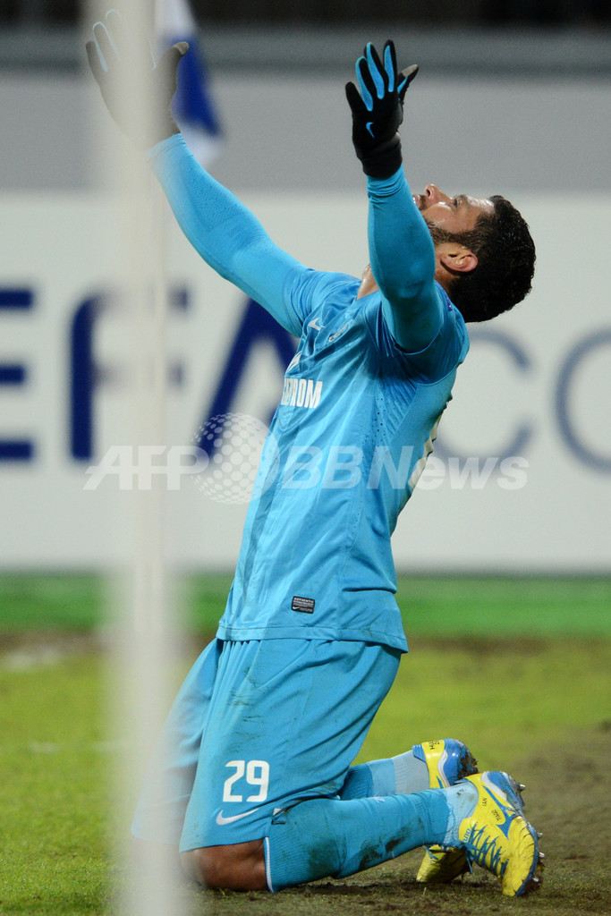 後半24分に先制点を挙げ歓喜するゼニト・サンクトペテルブルクのフッキ(Hulk、2013年2月14日撮影)。(c)AFP/KIRILL KUDRYAVTSEV