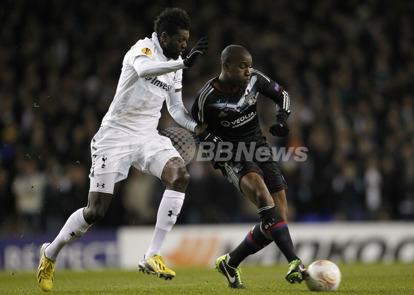 オリンピック・リヨンのグエイダ・フォファナ(Gueida Fofana、右)とボールを競るトッテナム・ホットスパーのエマニュエル・アデバヨール(Emmanuel Adebayor、2013年2月14日撮影)。(c)AFP/IAN KINGTON