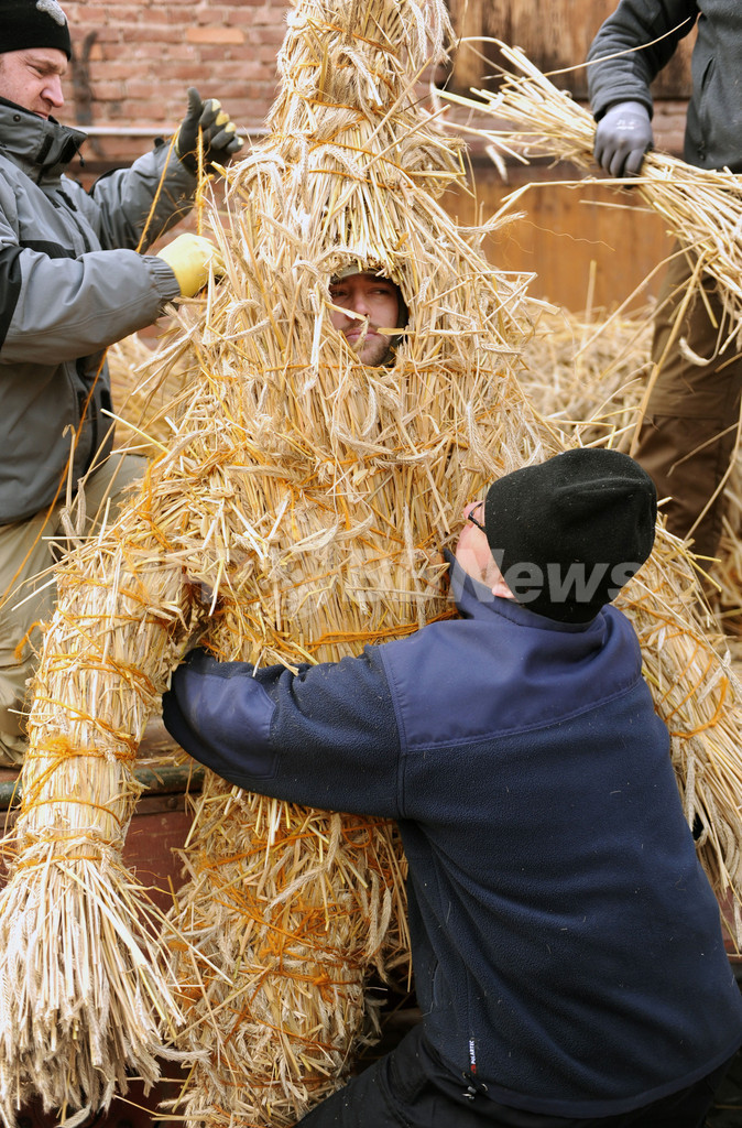 これは、麦わらをクマに見立てた仮装。ヘルドラ村では、冬を追い払う行事として「灰の水曜日」に麦わらのクマの仮装行列を行う風習がある。(c)AFP
