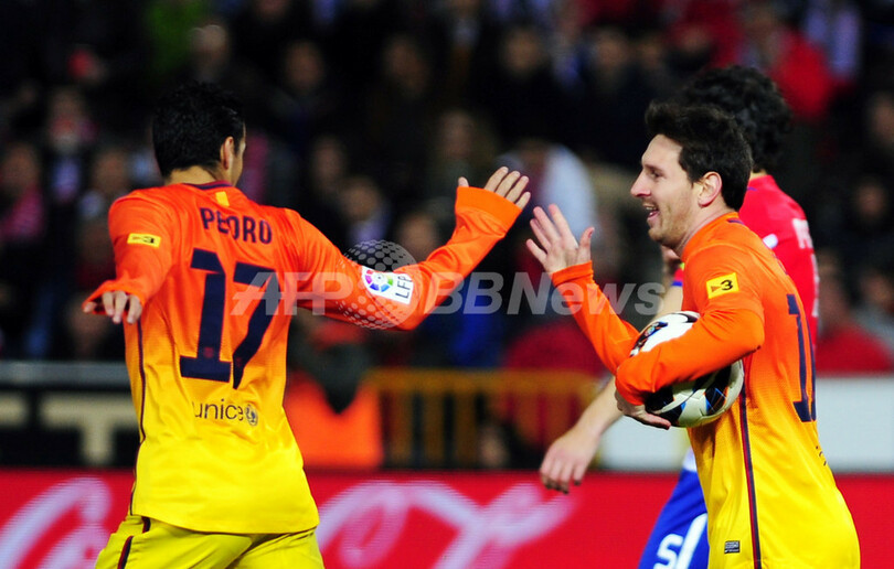 得点を挙げチームメイトのペドロ・ロドリゲス・レデスマ(Pedro Rodriguez Ledesma、左)と喜ぶFCバルセロナのリオネル・メッシ(Lionel Messi、2013年2月16日撮影)。(c)AFP/CRISTINA QUICLER