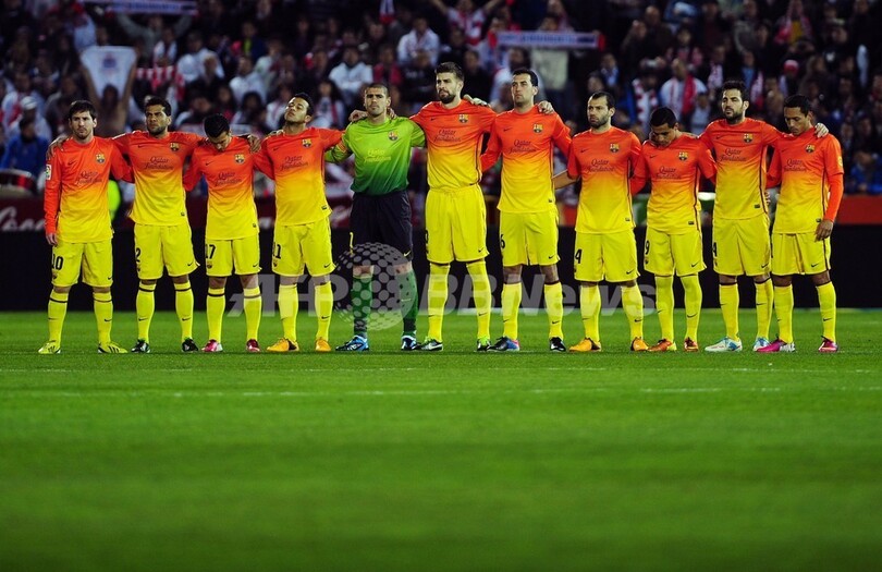 試合前に黙とうをささげるFCバルセロナの選手(2013年2月16日撮影)。(c)AFP/CRISTINA QUICLER