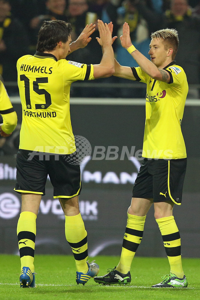 得点を喜ぶボルシア・ドルトムントのマッツ・ヒュンメルス(Mats Hummels、左)とマルコ・ロイス(Marco Reus、2013年2月16日撮影)。(c)AFP/Kevin Kurek