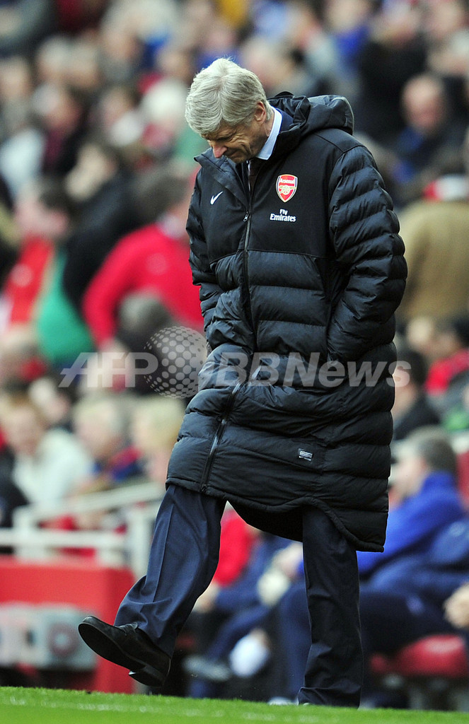 落胆した様子を見せるアーセナルのアーセン・ベンゲル(Arsene Wenger)監督(2013年2月16日撮影)。(c)AFP/GLYN KIRK