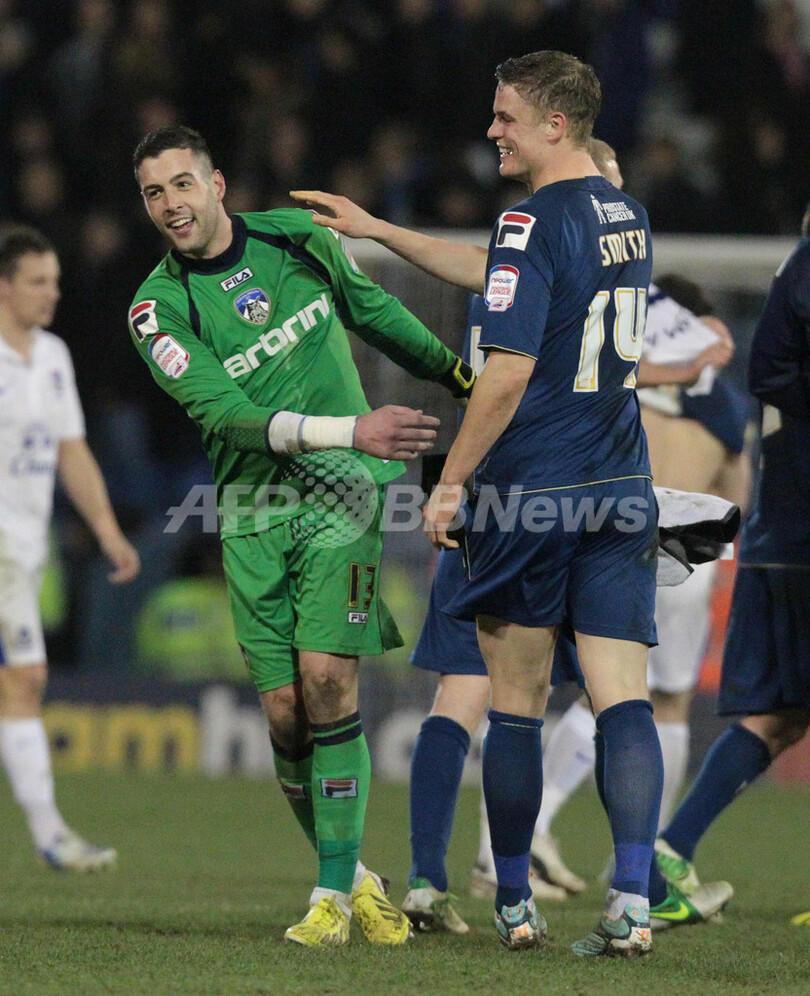 引き分けを喜ぶオールダム・アスレチックのGKディーン・ブザニス(Dean Bouzanis、左)とマット・スミス(Matt Smith、2013年2月16日撮影)。(c)AFP/LINDSEY PARNABY