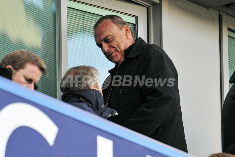 チェルシーのオーナー、ロマン・アブラモビッチ(Roman Abramovich、)氏(左)と言葉を交わすチェルシーの元監督、アブラム・グラント(Avram Grant)氏(2013年2月17日撮影)。(c)AFP/GLYN KIRK