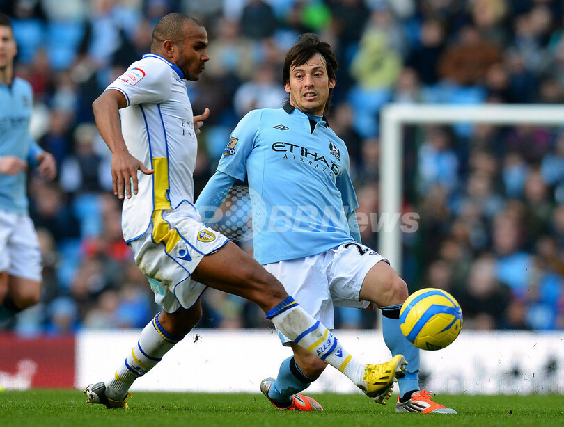 リーズ・ユナイテッドのロドルフ・オースティン(Rodolph Austin、左)とボールを競るマンチェスター・シティのダビド・シルバ(David Silva、2013年2月17日撮影)。(c)AFP/ANDREW YATES