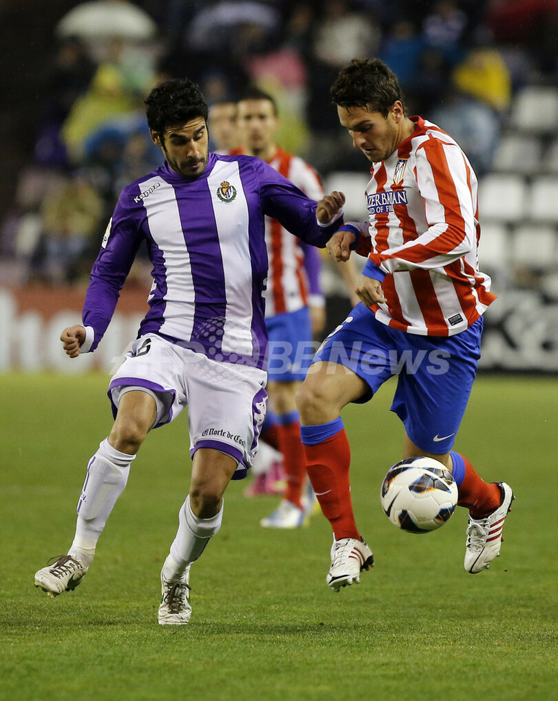 レアル・バジャドリードのルイス・サストレ(Lluis Sastre、左)とボールを競るアトレティコ・マドリードのコケ(Jorge Resurreccion Merodio "Koke"、2013年2月17日撮影)。(c)AFP/CESAR MANSO
