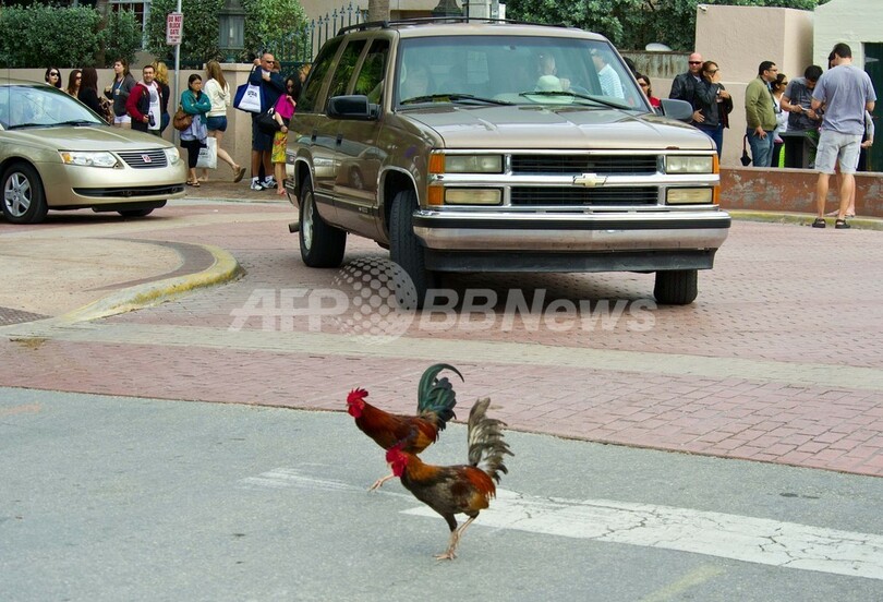 Key West)市内で16日、ニワトリの雄2羽が道路を横断するのを、一時停止して待っている自動車。